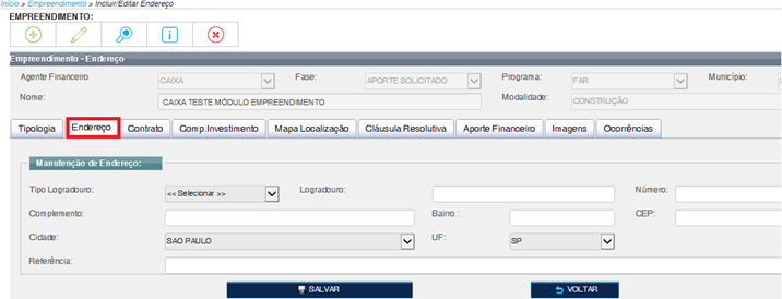 Cidade => campo virá preenchido com o mesmo município registrado no Empreendimento, mas poderá ser alterado, se necessário => PRENCHIMENTO OBRIGATÓRIO